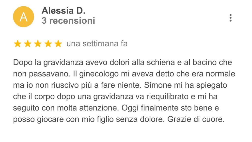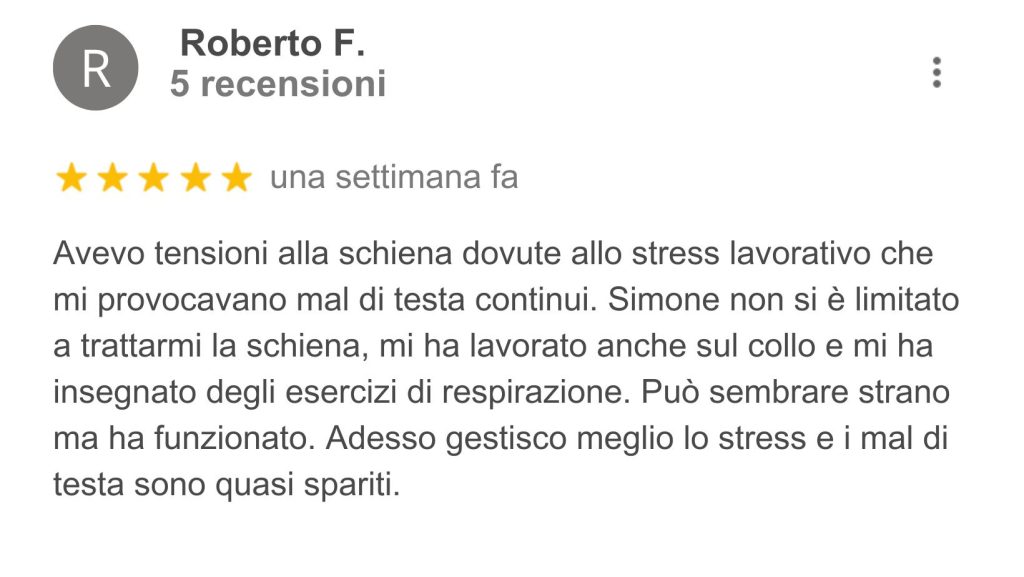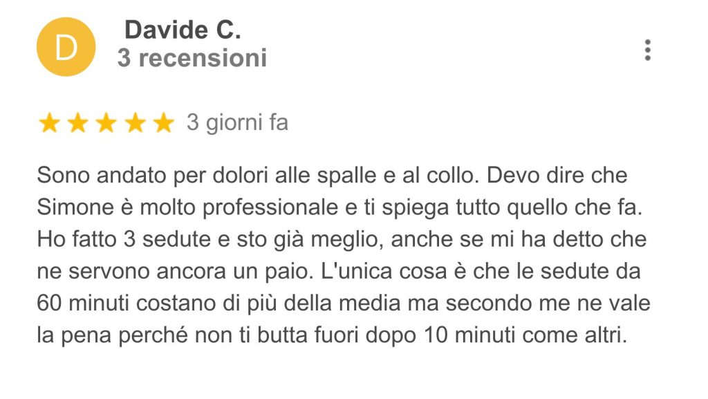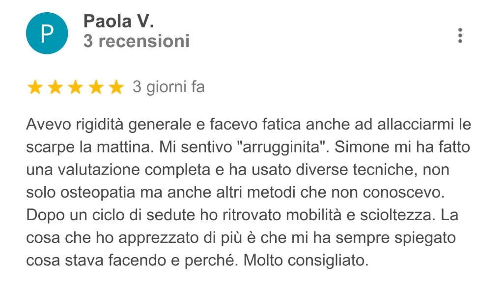 Pubblicato su Serena MagnantiTrustindex verifica che la fonte originale della recensione sia Google. Simone è stata una scoperta fortunatissima, arrivata proprio nel momento di maggior bisogno. Grazie al suo aiuto, sono riuscita a recuperare completamente le mie prestazioni atletiche dopo un infortunio che nessuno sembrava sapere come trattare. Consiglio vivamente di affidarsi alle sue competenze: un vero professionista, sempre aggiornato, in continua formazione e con una grande padronanza delle tecniche terapeutiche.Pubblicato su Giulia MaioloTrustindex verifica che la fonte originale della recensione sia Google. Simone è una persona e un professionista straordinario. Si percepisce subito la passione che mette nel suo lavoro e l’attenzione sincera verso i suoi pazienti. Riesce sempre a mettere a proprio agio, ascolta con calma e analizza con cura ogni problematica, cercando non solo di risolverla ma di ristabilire un equilibrio generale del corpo. Anche quando non serve un trattamento mirato, trova comunque il modo di aiutare, e alla fine di ogni seduta si esce sempre con una sensazione di benessere e leggerezza. Il suo approccio personale, umano e competente fa davvero la differenza: ci si sente capiti, seguiti e accompagnati in un percorso di miglioramento continuo. Consigliatissimo, sia per la professionalità che per la passione con cui si prende cura delle persone.Pubblicato su dario rocchiTrustindex verifica che la fonte originale della recensione sia Google. Simone è un’osteopata che dimostra professionalità e passione nel lavoro che svolge. Dalle prime diagnosi, ad un trattamento mirato, riesce a risolvere qualsiasi problema ma non solo… a studiarlo e capire come migliorare il corpo e la salute a tutto tondo! Consigliato, io ancora in cura da luiPubblicato su Silvia CastagnediTrustindex verifica che la fonte originale della recensione sia Google. Mi sono rivolta a Simone per dei dolori di schiena e postura insorti causa lavoro. Osteopata, appassionato del proprio lavoro, é attento, competente, disponibile, capace di mettere subito a proprio agio e super preciso nelle manovre da compiere. Grazie ai suoi trattamenti ho avuto da subito un netto miglioramento. Lo consiglio vivamente a chiunque cerchi un professionista giovane e all’avanguardia.Pubblicato su Stefania CucuzzaTrustindex verifica che la fonte originale della recensione sia Google. Professionista serio e preparato . Sia io che mio marito abbiamo avuto delle sedute con lui e abbiamo avuto degli ottimi risultati.Pubblicato su Laura CortellinoTrustindex verifica che la fonte originale della recensione sia Google. Mi sono trovata molto bene, ho avuto un grande giovamento su i miei dolori alla schiena e alle articolazioni . È stato in grado di mettermi a mio agio fin da subito ed ha saputo ascoltarmi con curaPubblicato su Vanessa MelchiorreTrustindex verifica che la fonte originale della recensione sia Google. Un professionista competente e attento, capace di mettere subito a proprio agio. Grazie al suo approccio preciso e personalizzato, ho ottenuto grandi miglioramenti in poco tempo. Consigliatissimo a chi cerca un osteopata serio e appassionato del suo lavoro! VanessaPubblicato su federica giannacciniTrustindex verifica che la fonte originale della recensione sia Google. Mi sono rivolta a questo osteopata per un fastidio che avevo da tempo e devo dire che l'esperienza è stata eccellente. Professionalità, competenza e grande attenzione al paziente: mi sono sentita subito a mio agio. Dopo poche sedute ho notato un netto miglioramento e una sensazione generale di benessere. Consiglio vivamente a chiunque cerchi un professionista serio, empatico e davvero preparato.Pubblicato su Angela MollicaTrustindex verifica che la fonte originale della recensione sia Google. Competente professionale e empaticoCarica di piùVerificato da TrustindexIl badge verificato di Trustindex è il Simbolo Universale di Fiducia. Solo le migliori aziende possono ottenere il badge verificato con un punteggio di recensione superiore a 4.5, basato sulle recensioni dei clienti degli ultimi 12 mesi. Per saperne di più